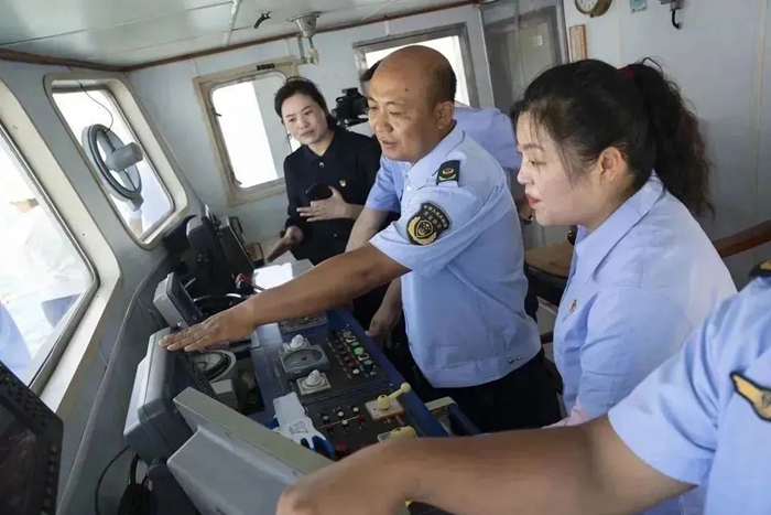 與以往不同,本次主題黨日活動登上漁政37605執(zhí)法船。正值禁漁期執(zhí)法階段,黨員代表們隨漁政執(zhí)法人員一起,出海巡航,沉浸式體驗海上執(zhí)法,感受海上執(zhí)法的艱辛與不易。