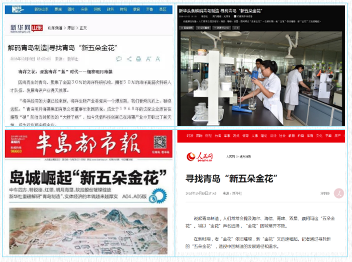 品牌成就城市,城市造就品牌。2016年8月,新華社“解碼青島”專題調(diào)研組抵青,圍繞“青島制造”的主題開展了集中調(diào)研,以“青島制造”為樣本,探尋中國(guó)制造之路。調(diào)研組先后到海爾、海信、青啤、雙星、澳柯瑪、明月海藻等22家知名企業(yè)進(jìn)行實(shí)地調(diào)研采訪。新華社在調(diào)研之后,陸續(xù)推出了一系列“尋找青島‘新五朵金花’”的報(bào)道,其中,青島明月海藻集團(tuán)因其鮮明的海洋品牌特色,被譽(yù)為青島“新五朵金花”之“海洋之花”。