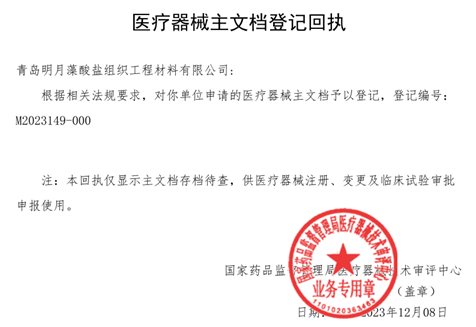 日前,青島明月藻酸鹽組織工程材料有限公司提交的《海藻酸鈉原材料主文檔》在國(guó)家藥品監(jiān)督管理局醫(yī)療器械技術(shù)審批中心獲得主文檔登記號(hào)M2023149-000。