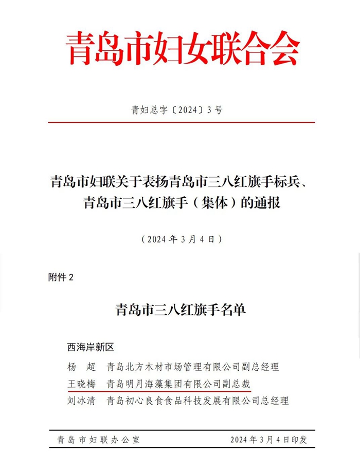 近日,青島市婦女聯(lián)合會發(fā)布《關(guān)于表揚青島市三八紅旗手標(biāo)兵、青島市三八紅旗手(集體)的通報》,其中,青島明月海藻集團有限公司副總裁王曉梅同志獲評青島市三八紅旗手榮譽稱號。