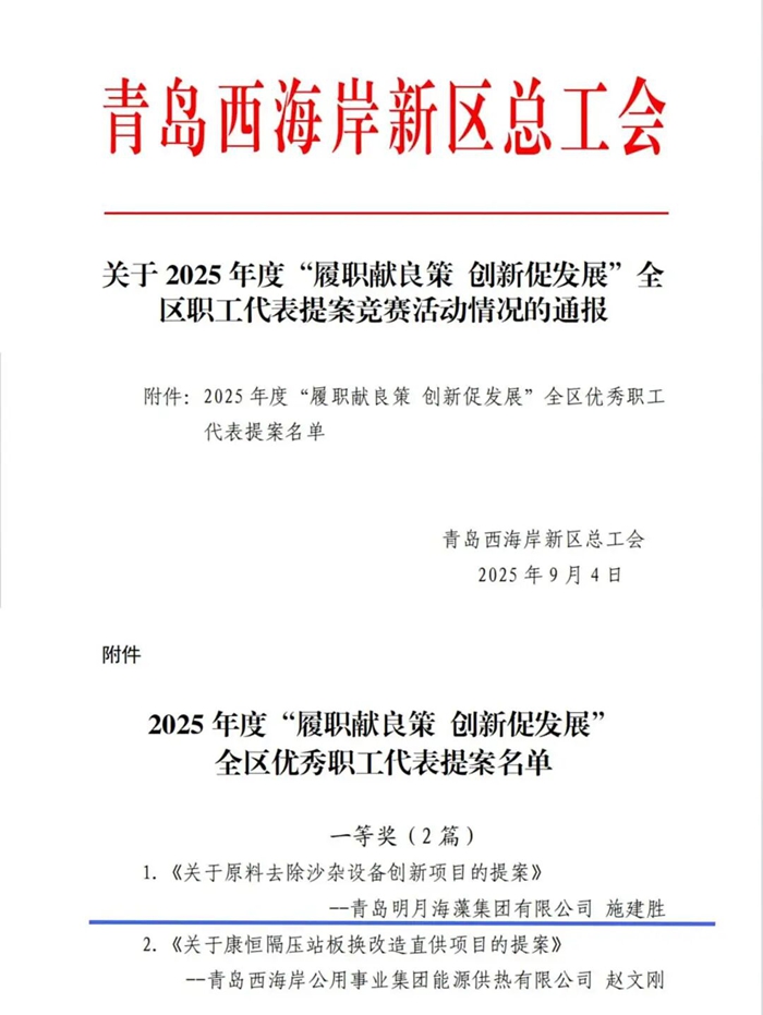 近日,在青島西海岸新區(qū)總工會主辦的“履職獻良策 創(chuàng)新促發(fā)展”職工代表提案競賽中,明月海藻集團提報的《關(guān)于原料去除沙雜設(shè)備創(chuàng)新項目的提案》從23件優(yōu)秀提案中脫穎而出,榮獲大賽最高獎項一等獎!