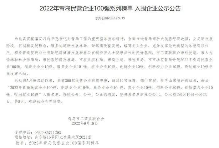 自今年5月份起,市工商聯(lián)聯(lián)合市科技局、市人力資源和社會(huì)保障局、市民營(yíng)經(jīng)濟(jì)發(fā)展局、市農(nóng)業(yè)農(nóng)村局、市商務(wù)局、市稅務(wù)局、市市場(chǎng)監(jiān)管局開(kāi)展2022年青島民營(yíng)企業(yè)100強(qiáng)、制造業(yè)企業(yè)10強(qiáng)、服務(wù)業(yè)企業(yè)10強(qiáng)、農(nóng)業(yè)企業(yè)10強(qiáng)、創(chuàng)新企業(yè)10強(qiáng)、創(chuàng)新潛力企業(yè)10強(qiáng)、吸納就業(yè)10強(qiáng)申報(bào)發(fā)布活動(dòng)。