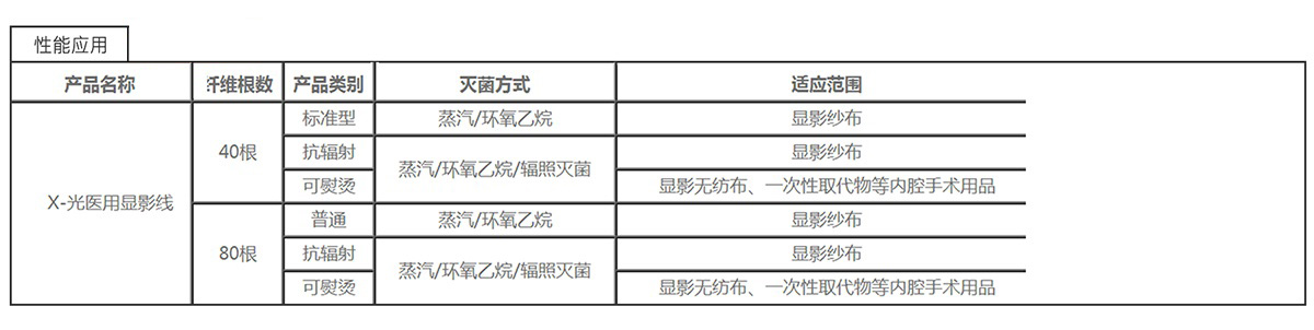 “潔靈絲”X-光醫(yī)用顯影線是通過采用先進的材料加工技術制備成型,由若干高分子長絲包覆后形成,其粗細度可根據(jù)用戶需要進行調(diào)整。本公司生產(chǎn)的“X-光醫(yī)用顯影線”的性能及加工工藝嚴格按照歐盟標準,產(chǎn)品具有很高的柔軟性及很好的物理機械性能,各項指標達到國際先進水平,可以與棉紗線一起織造后制備X-光顯影紗布,也可以通過加熱或超聲波方法與各種醫(yī)用織物粘合。